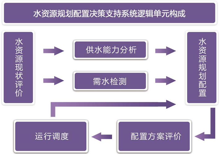 水量调配决策管理系统系统逻辑单元包括:水资源现状评价、供水能力分析、需水预测、水资源规划配置、配置方案评价、运行调度六个核心部分。